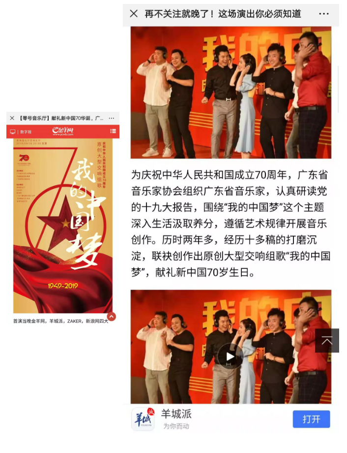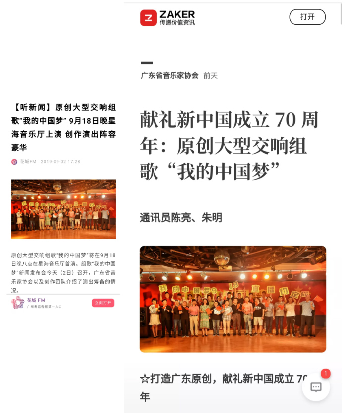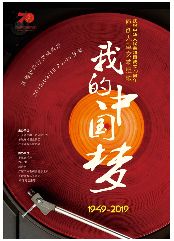 庆祝中华人民共和国成立70周年大型原创交响组歌“我的中国梦”音乐会由广东省文学艺术界联合会、羊城晚报报业集团、广东省音乐家协会联合主办,星海音乐厅、ZAKER 、新浪网、广东广播电视台音乐之声、《岭南音乐》杂志、@零号音乐厅共同协办,2019年9月18日晚20:00组歌将在星海音乐厅交响乐厅隆重首演,同时也是这部原创作品的世界首演。首演当晚金羊网,羊城派,ZAKER,新浪网四大媒体平台将同步高清网络直播。广东广播电视台音乐之声也将播出组歌现场录音的完整版。