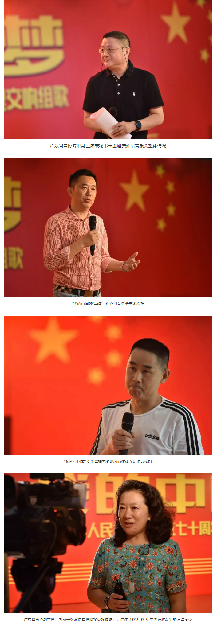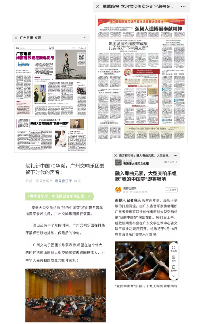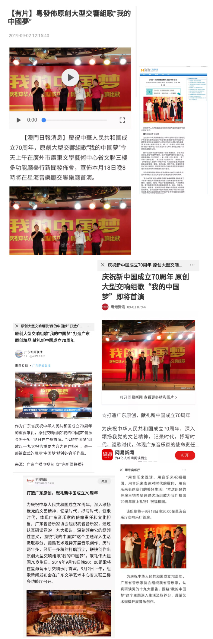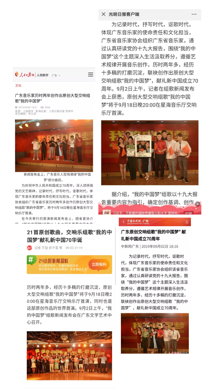 为庆祝中华人民共和国成立70周年,深入颂扬我党的文艺精神,记录时代,抒写时代,讴歌时代,体现广东音乐家的使命责任和文化担当,广东省音乐家协会组织我省音乐家,通过认真研读党的十九大报告,深刻领会它的纲领性意义,围绕“我的中国梦”这个主题深入生活汲取养分,遵循艺术规律开展音乐创作,历时两年多,经历十多稿的打磨沉淀,联袂创作出原创大型交响组歌“我的中国梦”,献礼伟大祖国70岁生日。2019年9月18日晚20:00组歌将在星海音乐厅交响乐厅首演,9月2日上午,组歌新闻发布会在广东文学艺术中心省文联三楼多功能厅召开。